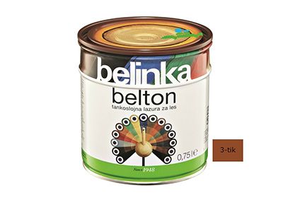 Belton je tankoslojna lazura koja štiti drvo od vremenskih utjecaja, a ujedno ga boja i oplemenjuje njegovu površinu.- tankoslojni lazurni premaz- štiti drvo od vremenskih utjecaja- za zaštitu drva unutar i izvan zgrada- lagano matiran, manje svilenkasti završni izgled- MIXTankoslojni Belton prodire u drvo te je prikladan za zaštitu dimenzijski nestabilnog drva. Koristi se zbog postizanja lagano matiranog završnog izgleda površine, pri čemu struktura drva nakon premazivanja ostaje vidljiva. Na raspolaganju je u 20 standardnih nijansi. Beltonom zaštićujemo vanjske dijelove krovišta, fasadne obloge, ograde, vrtne kućice, vrtni namještaj te druge drvene elemente unutar i izvan zgrada. Ako je drveni element izložen vremenskim utjecajima ili se nalazi u vlažnim prostorijama, preporučujemo impregnaciju Bellesom. Pri obnavljanju možete djelomično izbjeći tamnjenje površine tako da obojenom Beltonu dodate najviše 30 % bezbojne lazure i takvom mješavinom premažete površinu.UpozorenjeBezbojni Belton nije prikladan za zaštitu drva na otvorenom. Ako želimo sačuvati prirodan izgled drva koje je izloženo vremenskim utjecajima, trebamo ga zaštititi Beltopom uv plus.UpotrebaPremaz najprije dobro promiješajte. Nanosi se nerazrijeđen kistom u tri sloja na suho, čisto i izbrušeno drvo. Vani ili u vlažnim prostorijama drvo najprije impregnirajte Bellesom. Pri normalnim vremenskim uvjetima neka bude vrijeme sušenja između pojedinih slojeva premaza 24 sata. Alat odmah nakon uporabe očistite Belsolom ili razrjeđivačem za alkidne premaze (white špiritom).Tehnički podaciSastav: alkidne smole, svjetlosno i vremenski postojani pigmenti, aditivi i bezaromatska otapala. Sadrži 2-butanon oksim. Može izazvati alergijsku reakciju. Broj slojeva: 3 sloja (na otvorenom i u vlažnim prostorijama najprije sloj Bellesa) Potrošnja: 1 l za 10–12 m2 kod tri sloja premaza (ovisno o vrsti i kvaliteti drva, površinskoj obradi te načinu nanošenja) Sušenje: sljedeći sloj nakon 24 sata (u normalnim uvjetima) Čišćenje alata: Belsolom ili white spiritom Skladištenje: čuvajte ga u originalnoj ambalaži pri temperaturi nižoj od 30 °C, izvan dohvata djece. Neiskorišteni ostatak Beltona prelijte u odgovarajuću manju ambalažu (koja mora biti napunjena do vrha) i dobro zatvorite. Ne sadržava biocide. Plamenišče: nad 61 °C Ambalažne jedinice: 0,75 l, 2,5 l, 5 l, 10 lIzračun potrošnje1m2 = 0,05 lit (za jedan nanos)