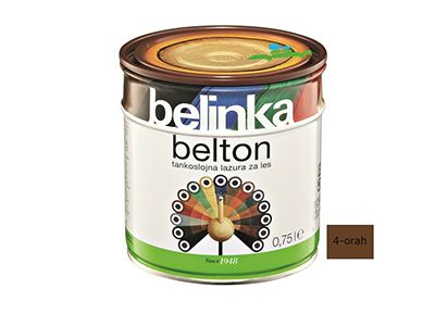 Belton je tankoslojna lazura koja štiti drvo od vremenskih utjecaja, a ujedno ga boja i oplemenjuje njegovu površinu.- tankoslojni lazurni premaz- štiti drvo od vremenskih utjecaja- za zaštitu drva unutar i izvan zgrada- lagano matiran, manje svilenkasti završni izgled- MIXTankoslojni Belton prodire u drvo te je prikladan za zaštitu dimenzijski nestabilnog drva. Koristi se zbog postizanja lagano matiranog završnog izgleda površine, pri čemu struktura drva nakon premazivanja ostaje vidljiva. Na raspolaganju je u 20 standardnih nijansi. Beltonom zaštićujemo vanjske dijelove krovišta, fasadne obloge, ograde, vrtne kućice, vrtni namještaj te druge drvene elemente unutar i izvan zgrada. Ako je drveni element izložen vremenskim utjecajima ili se nalazi u vlažnim prostorijama, preporučujemo impregnaciju Bellesom. Pri obnavljanju možete djelomično izbjeći tamnjenje površine tako da obojenom Beltonu dodate najviše 30 % bezbojne lazure i takvom mješavinom premažete površinu.UpozorenjeBezbojni Belton nije prikladan za zaštitu drva na otvorenom. Ako želimo sačuvati prirodan izgled drva koje je izloženo vremenskim utjecajima, trebamo ga zaštititi Beltopom uv plus.UpotrebaPremaz najprije dobro promiješajte. Nanosi se nerazrijeđen kistom u tri sloja na suho, čisto i izbrušeno drvo. Vani ili u vlažnim prostorijama drvo najprije impregnirajte Bellesom. Pri normalnim vremenskim uvjetima neka bude vrijeme sušenja između pojedinih slojeva premaza 24 sata. Alat odmah nakon uporabe očistite Belsolom ili razrjeđivačem za alkidne premaze (white špiritom).Tehnički podaciSastav: alkidne smole, svjetlosno i vremenski postojani pigmenti, aditivi i bezaromatska otapala. Sadrži 2-butanon oksim. Može izazvati alergijsku reakciju. Broj slojeva: 3 sloja (na otvorenom i u vlažnim prostorijama najprije sloj Bellesa) Potrošnja: 1 l za 10–12 m2 kod tri sloja premaza (ovisno o vrsti i kvaliteti drva, površinskoj obradi te načinu nanošenja) Sušenje: sljedeći sloj nakon 24 sata (u normalnim uvjetima) Čišćenje alata: Belsolom ili white spiritom Skladištenje: čuvajte ga u originalnoj ambalaži pri temperaturi nižoj od 30 °C, izvan dohvata djece. Neiskorišteni ostatak Beltona prelijte u odgovarajuću manju ambalažu (koja mora biti napunjena do vrha) i dobro zatvorite. Ne sadržava biocide. Plamenišče: nad 61 °C Ambalažne jedinice: 0,75 l, 2,5 l, 5 l, 10 lIzračun potrošnje1m2 = 0,05 lit (za jedan nanos)