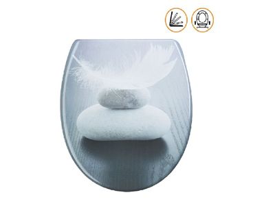 Opis: WC daska HARMONY je izrađena od visokokvalitetnog duroplasta. Ima ukrasan i originalan print kamenčića i bijelo pero na gornjem dijelu preklopa. Unutrašnjost je u potpunosti bela. Opremljen je sistemom mekog zatvaranja i lakog otpuštanja koji ga čini bezbednim i tihim za upotrebu, tako da je održavanje čistoće i higijene mnogo lakše nego kod tradicionalnih dasaka. WC daska je dostupna sa kompletom za montažu.