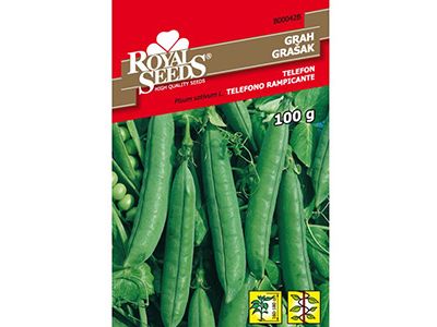 Grašak Telefon je vrlo visoka sorta visine 160-180 cm, koja sazrijeva za oko 85-90 dana. Daje zelene mahune dužine 11-12 cm sa naboranim ukusnim zrnima.