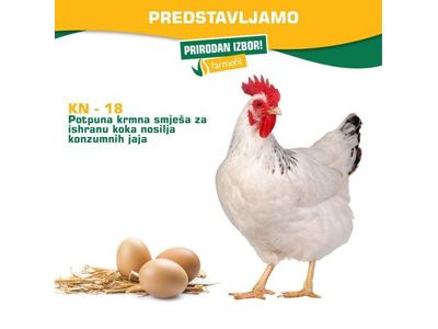 Potpuna krmna smješa za ishranu koka nosilja konzumnih jaja, komercijalnog naziva KN-18, sadrži minimalno 18% sirovih proteina i namijenjena je mladim nosiljama, sa novim jatom. Smješu treba koristiti prva dva mjeseca, nakon čega preporučujemo prelazak na na smješu KN-1, sa 16.5% sirovih proteina.