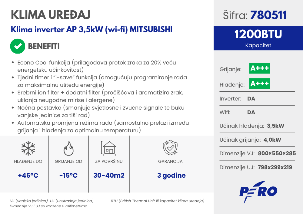 Ovaj napredni model proizvođača Mitsubishi Electric osvaja brojnim funkcionalnostima, privlačnim izgledom i kompaktnom izvedbom. Uz tih i pouzdan rad, Mitsubishi Electric serije AP nudi integrisano WiFi sučelje. Također, koristi novi, ekološki prihvatljiv rashladni medij R32 i upravo zahvaljujući njemu i naprednoj inverterskoj tehnologiji spada u uređaje odlične energetske učinkovitosti razreda A+++. Sa snagom od 3.5 kW pouzdano će rashladiti prostorije do 35 m2.