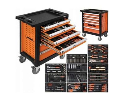 Ormar sa opremom 302 kom. Sthor 58550 se prvenstveno koristi u radionicama i garažama. Poseduje 6 fioka postavljenih na klizače sa kugličnim ležajevima, a svaka od njih ima po 12 modula za alate i pribor, što omogućava veći red, što znači bolju organizaciju rada. Profili ormara za alat 58550 izrađeni su od čeličnog lima, što u kombinaciji sa ugaonim branicima čini model koji karakteriše visoka izdržljivost i otpornost na mehanička oštećenja. Centralna brava povećava sigurnost pohranjenih stvari. Ploča stola je izrađena od polipropilena, zahvaljujući čemu ima svojstva protiv klizanja - operater može na njoj izvoditi manje radove. Gumeni točkovi sa kočnicama povećavaju upravljivost i omogućavaju stabilno postavljanje ormarića. Uz kabinet, operater dobija opremu u vidu ručnog alata i pribora.