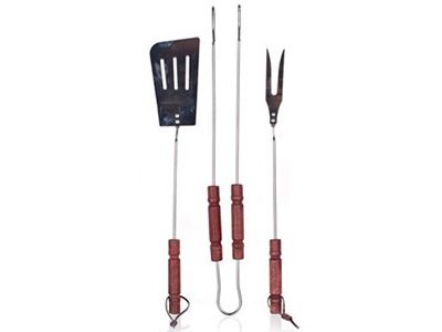 Trodijelni pribor za roštilj uključuje klješta, tokar i vilicu izrađenu od kromiranog čelika.