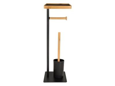 Opis: Kupaonski stalak s WC četkom. Izrađen je od crno obojenog čelika s mat završnom obradom. Ima ukrasne elemente od prirodnog bambusa. Kupaonski stalak opremljen je funkcionalnom, modernom policom za mobitel ili higijenski pribor.