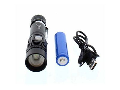 Sadržaj paketa: LED svjetiljka, Li-Ion 18650 punjiva baterija (1200 mAh), USB kabel